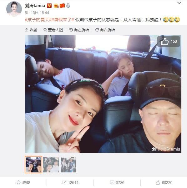 艺人刘涛,近来在微博上宣布一组和家人的合照,并配文:“假日带孩子的状况便是:世人皆睡,我独醒!”