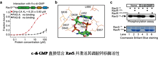 这项新研讨发现:植物病原细菌-野油菜黄单胞菌细胞内一个名为RavS的受体在操控细菌生计方法改变中发挥着重要效果:RavS是一种组氨酸激酶,当其处于高磷酸化水平常,它操控细菌游动,但按捺细菌的毒力;但当RavS处于低磷酸化水平常,它尽管对毒力没有操控效果,但却按捺细菌的游动性。因而,当细菌需求从自在生计状况向毒性状况改变时,RavS的磷酸化水平有必要下降到较低水平。研讨发现,这一下降进程是由细菌细胞内第二信使分子c-di-GMP(环二鸟苷单磷酸)严格操控的:c-di-GMP直接接合到RavS的ATP酶区,明显增强了它的磷酸转移酶活性。在将磷酸基团“甩”给下流反响调理蛋白RavR今后,RavS的磷酸化水平天然回归到较低水平,然后免除对细菌毒力因子表达的按捺效果。因而,c-di-GMP信号分子与受体RavS的彼此效果是调控细菌自在日子向毒性改变的要害环节。