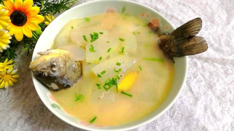 需求食材:鲫鱼1条,冬瓜250克,葱花2克,姜5克,油25克,料酒50克,盐5克,开水500克