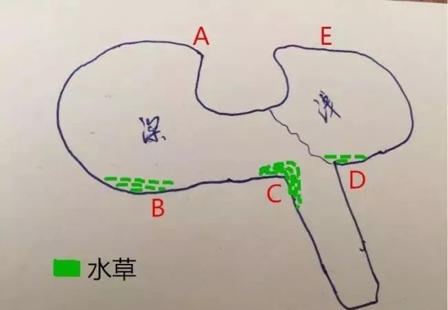 一:图示的钓点是一个野塘,左右分别是深水区和浅水区,A/B/C点处于深水区,D/E钓点处于浅水区,而且B/C/D点都有水草。现在是夏日,想钓鲢鳙,大师们看看这儿选哪个钓位比较适宜。