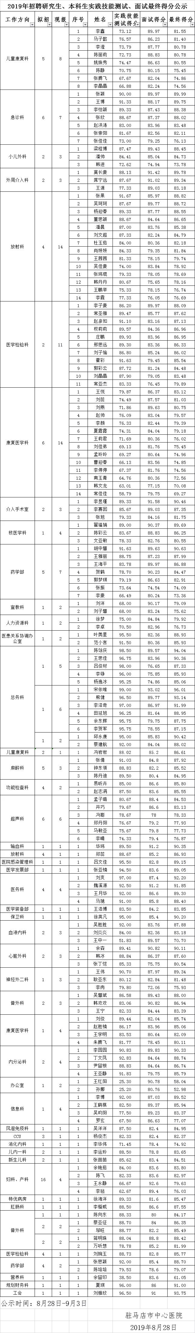 现将驻马店市中心医院2019年招聘研究生、本科生实践技术测验、面试终究得分状况予以公示。