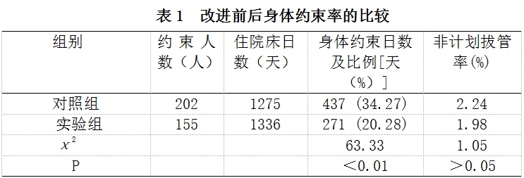 采纳意图抽样法,对某医院ICU患者进行研讨。该ICU敞开床位20张,挑选2017年4月-6月、2017年10月-12月运用束缚东西的患者为研讨方针。其间,2017年4月-6月运用束缚东西患者202例为对照组(改善前),束缚天数437天;性别:男120例,女82例;年纪:16岁~88岁,均匀(54.7±14.1)岁;首要确诊:肝移植术后、重症肺炎、重度颅脑外伤、肝叶切除术、缓慢阻塞性肺疾病、脓毒症、重症胰腺炎、多发伤、肺叶/全肺切除术后、胰十二指肠切除术后等。2017年10月-12月运用束缚东西患者155例为实验组(改善后),束缚天数271天;性别:男82例,女73例;年纪:15岁~86岁,均匀(56.7±13.8)岁;首要确诊:肝移植术后,缓慢阻塞性肺疾病、脓毒症、重症胰腺炎、重度颅脑外伤、肝叶切除术后、多发伤、肺叶/全肺切除术后、胰十二指肠切除术后等。比较两组基线材料无统计学差异,具有可比性。