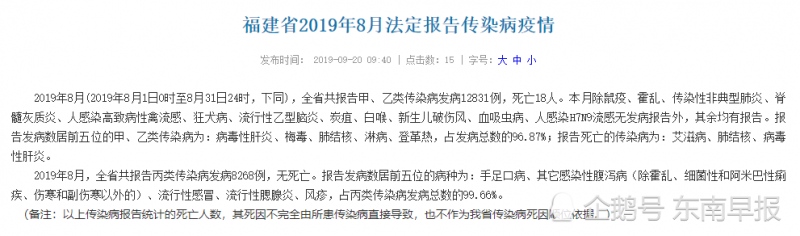 早报讯(记者赖劲松)近来,福建省卫健委对外通报福建省2019年8月法定陈述感染病疫情称,2019年8月,全省共陈述各类感染病发病21099例,逝世18人。陈述逝世的感染病为艾滋病、肺结核、病毒性肝炎。值得注意的是,丙类感染病方面,陈述发病数居前五位的病种包含手足口病、流行性感冒等。当本年前8个月,福建已有142人被各类感染病夺去了生命,数据触目惊心。