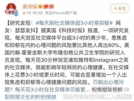 但是就在最近,据美国《科技时报》报导,每天阅读交际媒体渠道超越3小时的青少年,患焦虑和郁闷等心思疾病的危险要比其别人高出60%。