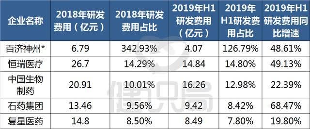 研制费用投入是企业研制新产品及未来继续增加的内源性动力。从研制费用投入状况来看,百济神州、恒瑞医药和我国生物制药研制费用金额投入和研制费用占同期经营收入的份额都远远领先于其他企业。尤其是百济神州,假如换算成人民币,现在现已超越恒瑞医药和我国生物制药成为研制投入最大的企业,2019年上半年研制投入已超越25亿元人民币。