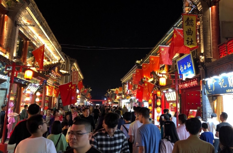 新华社太原10月3日电(记者张磊、梁晓飞)青砖灰瓦、雕梁画栋的老街缀满国旗和灯笼,红红火火的场景与国庆假日的气氛相辅相成。这是坐落山西省太原市的“网红打卡地”——食品街,一条因“夜经济”重获重生的商业老街。