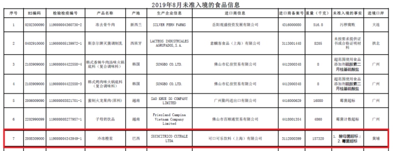 新京报讯(记者 王子扬)海关总署日前发布2019年8月全国未准入境食物信息显现,由可口可乐饮料(上海)有限公司进口的巴西冷冻橙浆因为酵母菌、霉菌超支未准入境。此外,日本小林制药、新西兰亿纯等品牌产品也未准入境。