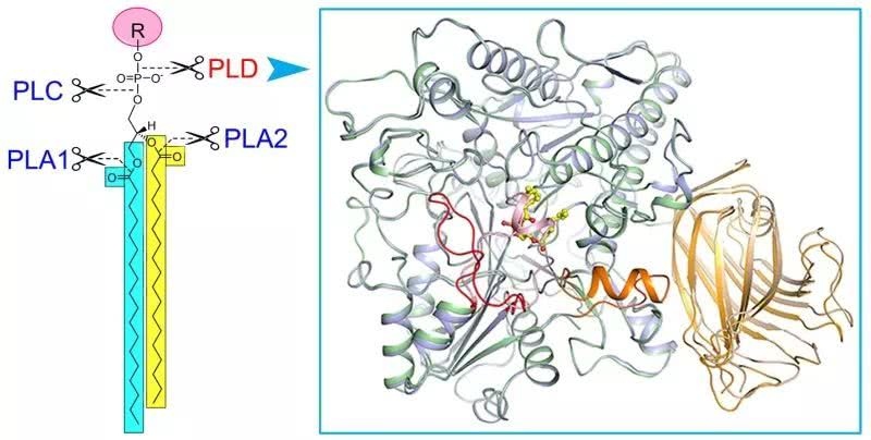 图:脂酶D及晶体结构。左图显现不同磷脂酶(PLA1、PLA2、PLC、PLD)催化磷脂水解的位点,右图为磷脂酶D与产品磷脂酸(黄色棍棒模型)结合前后的三维结构叠加图,显现底物结合前后的构象变化。