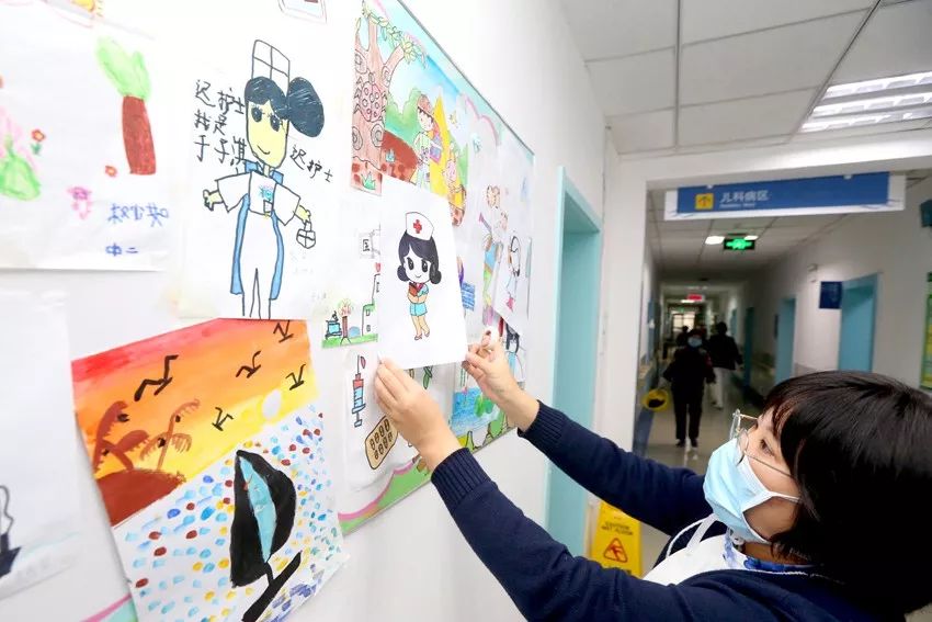 上午9点,记者来到了市立医院西院区儿科病房,刚走到门口就听到一个孩子的声响,"护理阿姨,我来交作业啦!"走进病房,记者看到是一位住院的小患者带着自己的画来找护理。"川川画得真好,咱们一同把它挂到墙上吧。"护理长刘国力接过孩子手中的画并对他说道。