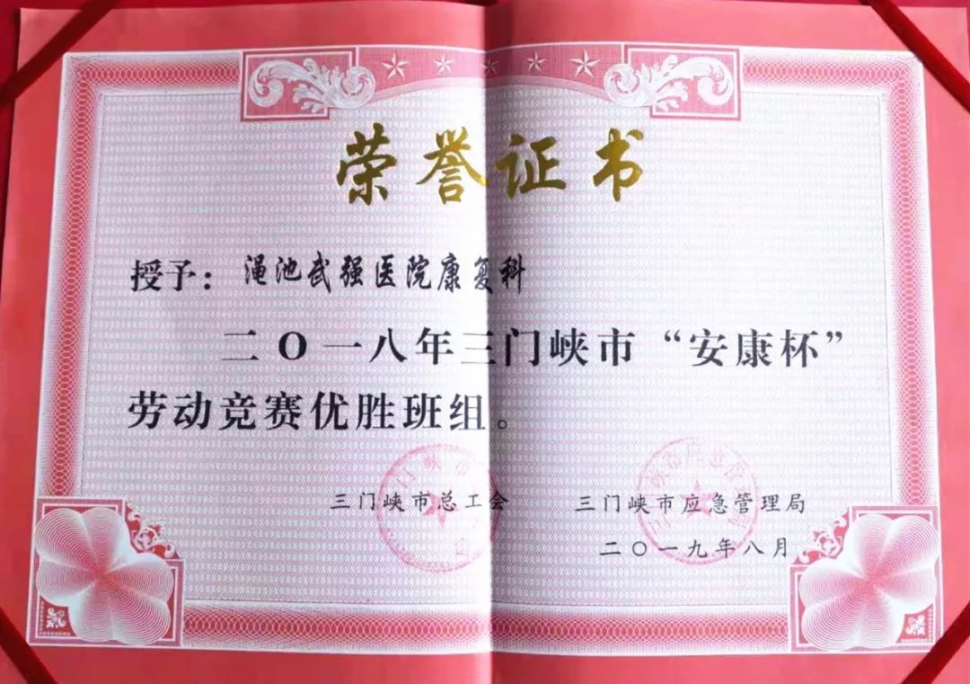 近来,渑池武强医院康复科被三门峡市总工会、三门峡市应急办理局颁发2018年度“安康杯”比赛优胜班组。