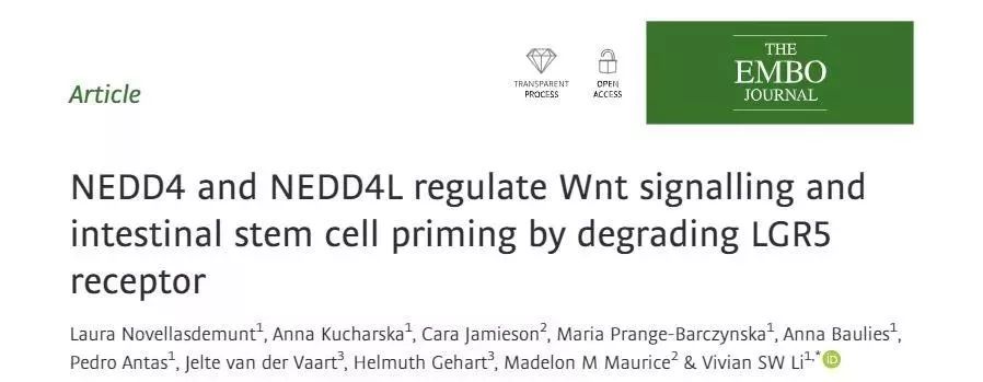 研究者使用RNAScop原位杂交(in situ hybridisation,ISH),发现Nedd4首要表达在隐窝干细胞区,而Nedd4l均匀分布于隐绒毛轴,两个基因表达的酶蛋白——神经元前体细胞发育下调蛋白4(Neuronal precursor cell developmentally downregulated protein 4, NEDD4)和同源蛋白NEDD4L能够按捺Wnt通路,后者在细胞成长和测定中有及其重要的效果。