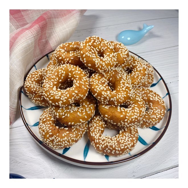 4:然后揉均匀成团,就能够开端做了,取一点面团搓条,然后弄成圈,滚芝麻
