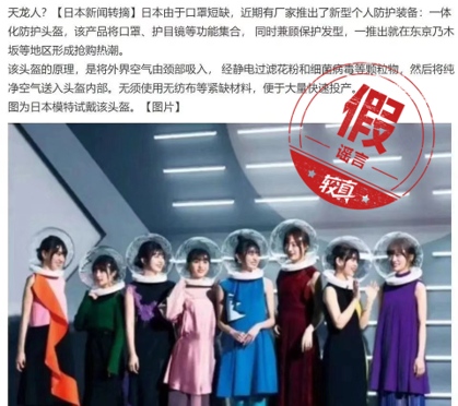最近有音讯称:“日本有厂家推出了一体化防护头盔,该产品将口罩、护目镜等功能调集,一起统筹维护发型。”传言还配了一张日本模特试戴该头盔的图片。通过查验,这是条假音讯。较真检索了揭露报导,无论是日本干流媒体,仍是交际网络,都并未有日本厂家推出防护头盔的音讯。别的,配图也并非“日本模特正在试戴该头盔”,而是日本女子偶像组合“乃木坂46”第25张单曲《美好的维护色》的封面之一。