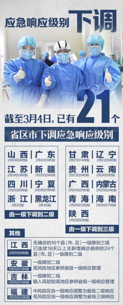 到3月4日19时,山西、广东、江苏、新疆、四川、宁夏、浙江、黑龙江等8省份将新冠肺炎疫情防控应急呼应等级由严重突发公共卫生事件一级呼应调整为二级呼应。甘肃、辽宁、贵州、云南、广西、内蒙古、青海、海南、山西等9省份将新冠肺炎疫情防控应急呼应等级由严重突发公共卫生事件一级呼应调整为三级呼应。一起还有四省依据省内区域不同的危险程度,分区分级地进行精准防控。