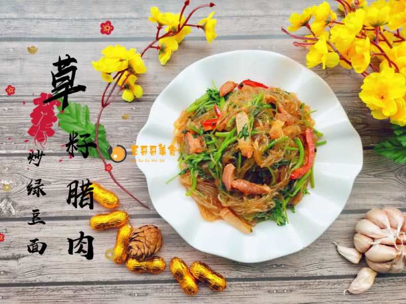 制品展现图:这样一道家常甘旨,秀色可餐的草籽腊肉炒绿豆面就做好了!