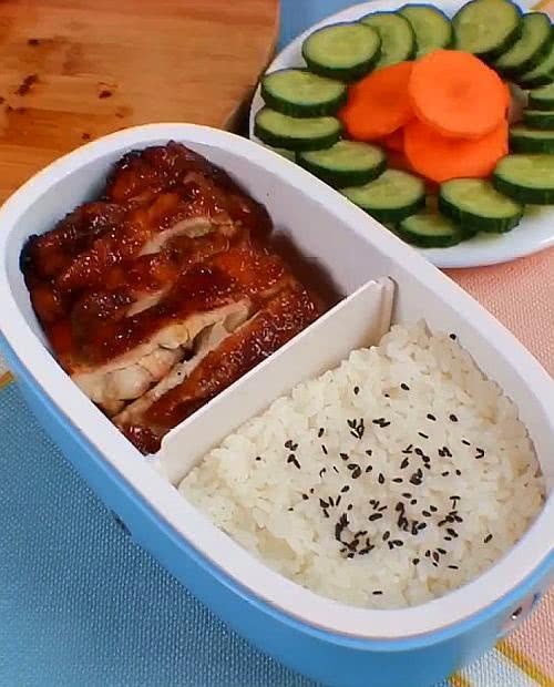 5、在饭盒装入米饭,再把切好的鸡腿铺在米饭的上面,然后再配上一些自己最喜爱吃的蔬菜,这样一道超级养分甘旨的便利就制造完成了。关键是特别实惠,而且健康又卫生,开工第一天,老公迷上了这便利,在家天天早上让我做,简略养分又好吃,喜爱的话,咱们都赶忙做一份试试吧。