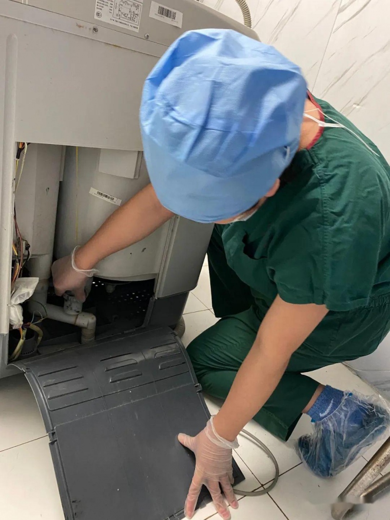 3月3日,保洁员发现洗衣机呈现问题,不能进行正常清洗作业。刘娜娜了解状况后,自动上报并及时联络器械设备处,反映洗衣机不能正常作业给手术室清洗作业带来的影响,器械设备处终究联络到修理洗衣机的工程师。疫情当时,工程师进入现场防护程序杂乱,为了最大程度削减外来人员的危险、节省有限的防护资源,毫无修理经历、身怀六甲的刘娜娜挽起袖子,在工程师电话指导下,手拿螺丝刀、脚踩说明书,终究让洗衣机康复正常作业。修理机器的1个小时里,她一点点没注意到臃肿的双脚现已湿透,双腿早已发麻,豆大的汗珠滴滴答答。看到洗衣机正常作业,她脸上露出了成功的高兴!