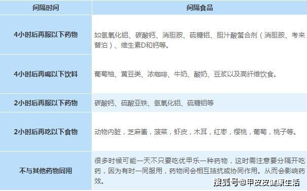 用饮用水送服,不与其他药物同服。许多时分或许一天不只需吃优甲乐一种药物,这时需留意要分离隔吃药,由于有时一起服用,药物间会彼此拮抗或协同效果。从而会影响药效。