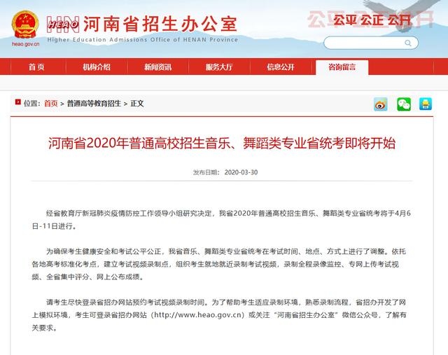 经省教育厅新冠肺炎疫情防控作业领导小组研究决定,我省2020年普通高校招生音乐、舞蹈类专业省统考将于4月6日-11日进行。