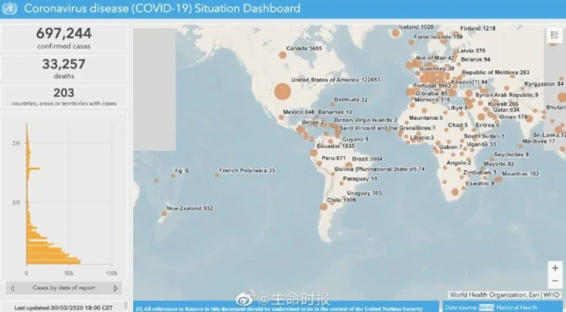 新冠肺炎疫情在全球持续发酵,到北京时刻31日0时,全球确诊新冠肺炎697244例。