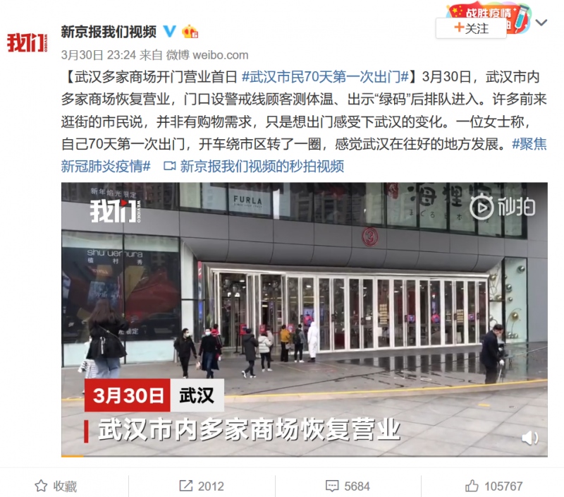 由新京报“我们视频”旗下热点新闻栏目@紧急呼叫 主持的#武汉市民70天第一次出门#,成为围绕“武汉商场恢复营业”事件最火热的微博话题。截至31日12时超过2亿人次阅读,网友纷纷留言表示看好武汉: