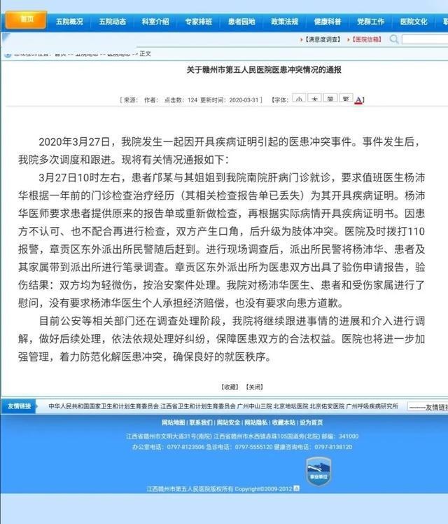 原标题:官方回应:关于赣州市第五人民医院医患抵触状况的通报