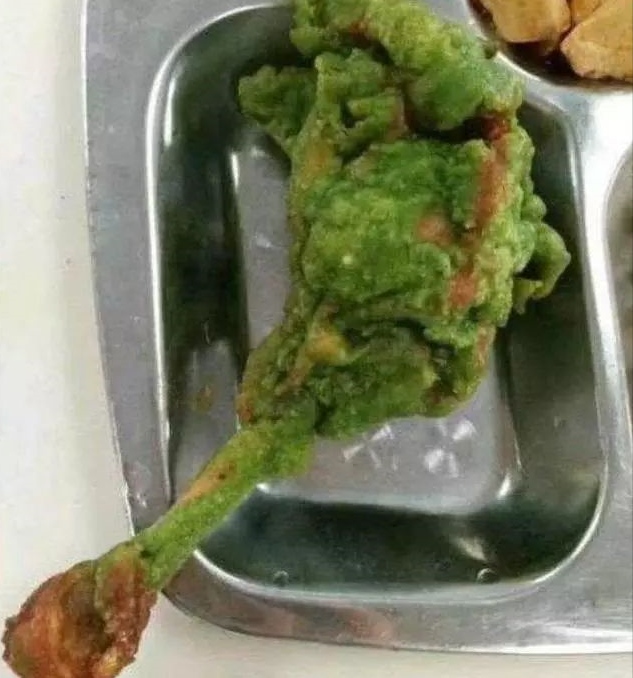 在许多校园的食堂,都有鸡腿吃,并且滋味不错价格也不贵,可是在看到这个宽恕色的鸡腿后,小编就缄默沉静了,绿色可拿来描述青菜,可是用来描述鸡腿,就有点厌恶了,这绿莹莹的鸡腿就像是长满了青苔相同,让人心里直发毛,谁吃谁便是大佬!