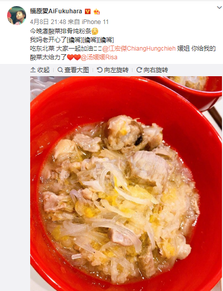 北京时间4月8日晚,日本前工作乒乓球运动员福原爱在交际平台上秀了一把自己的厨艺:“今晚煮酸菜排骨炖粉条,我妈老高兴了。吃东北菜,我们一同加油。媛姐,你给我的酸菜太给力了。”还趁便@老公江宏杰,美好的滋味扑面而来。