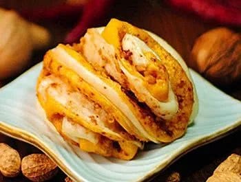 2. 将两个面团别离擀成椭圆形,白色面饼外表刷适量的植物油,将南瓜面饼叠到上面,把核桃碎均匀的撒到面饼上面,卷起来搓成均匀的长条。