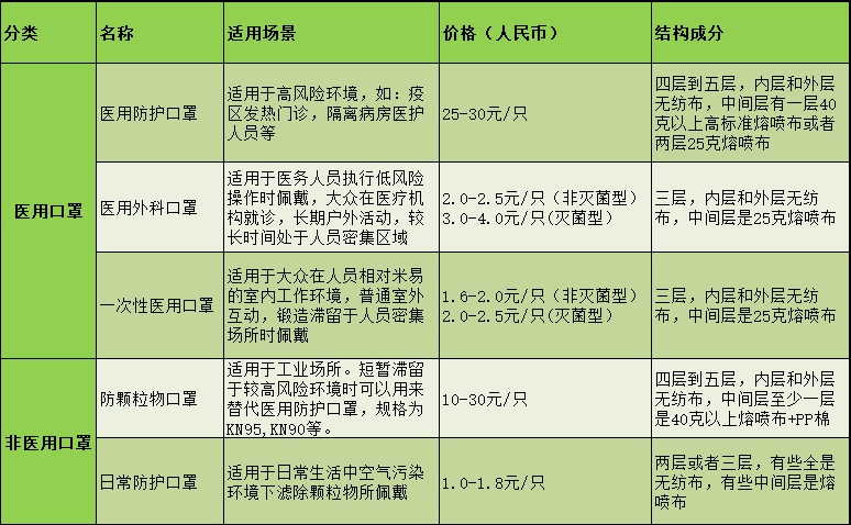 其实负责供应链的人都知道,质量上的问题实际上就是价格问题,价格多少决定质量的好坏,产品执行标准越高,价格越贵,一分钱一分货。以最常用的口罩为例,中国的基本分类标准和对应价格如下表所示: