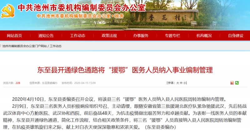 日前,东至县委编办在安徽省池州市编制委员会办公室门户网站发布音讯称,2020年4月10日,东至县委编委召开会议,将该县三名“援鄂”医务人员归入县人民医院周转池编制内办理。