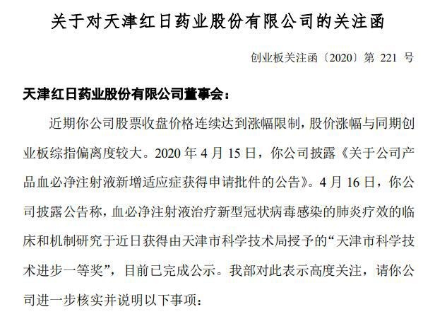 趁着血必净注射液获批用于新冠肺炎的利好音讯,红日药业(300026.SZ)也收成接连三个涨停板,但就在日前,公司收到深交所重视函。