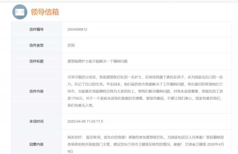 4月上旬,甘肃省卫健委网站领导信箱有援鄂医护人员发布了一条题为“援鄂临聘护理能不能处理一下编制问题”的咨询帖,其间提到,可亲可敬的父母官,我是援鄂医疗队的一名护理,在前哨我抛下爹妈及孩子,来为国家出自己的一份力,忘记了自己的存亡。安全回来,咱们省的各市级都处理了作业编制问题,我也诚恳的期望咱们兰州市,也能看在我能献身自我为咱们的份上,帮咱们处理编制问题,对我来说很重要,我现在的薪酬是1700元,关于一个家庭来说我在困难的支撑着,望领导注重,不要让咱们心疼,国家有难有咱们,咱们有难无人帮。