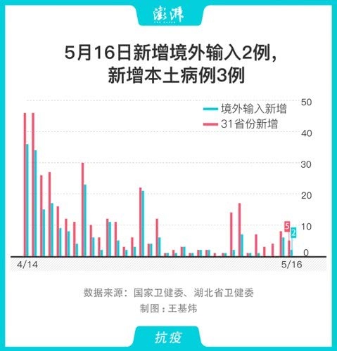 据国家卫健委音讯,5月16日0—24时,31个省份(含兵团)陈述新增新式冠状病毒肺炎确诊病例5例,其间境外输入病例2例,本乡病例3例;无新增逝世病例;新增疑似病例2例,均为境外输入病例。