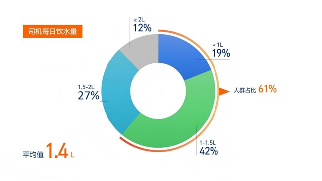● 饮水习惯:61%的司机每日饮水量低于《中国居民膳食指南(2022)》及世界卫生组织建议的最低标准(1500-1700毫升),其中19%甚至不足1升,可能会增加泌尿系统负担。