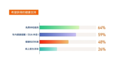 ● 期待健康支持:64%的司机希望获得免费体检服务,59%期待车内健康提醒,如饮水、休息提示等。