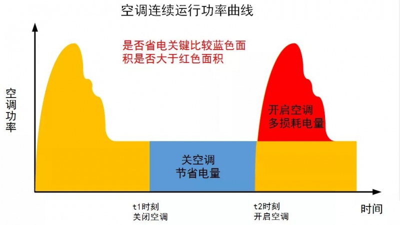 其中,黄色区域代表空调耗电量,蓝色区域代表空调关闭节省的电量,红色区域代表再次开启空调多损耗的电量。
