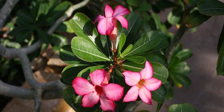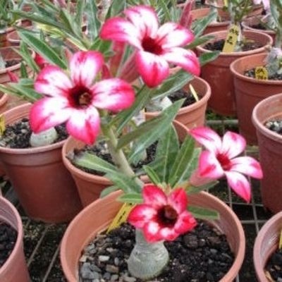 沙漠玫瑰其实名不副实,它既不生长在沙漠地区,和玫瑰也没什么关系。它又名天宝花,是一种夹竹桃科天宝花属的多肉植物。作为灌木或小乔木,这种植物能长到4.5米高,树干肿胀,看上去就像挺着个大肚子一样。它的叶子互生,形状为倒卵形,长度可达15厘米。每年的5-12月是它的花期,会开出红色、玫红色、粉红色和白色的花,其花喇叭形,十分艳丽,有很高的观赏价值。