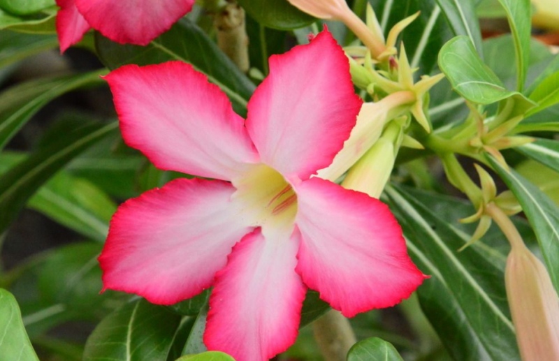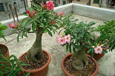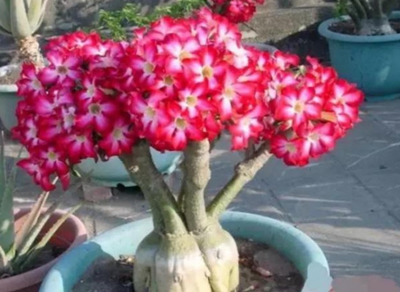 想要让沙漠玫瑰开花,最好的办法不是提供良好的水肥,这样只会让它继续茁壮生长,而不是想着开花繁衍。只有通过停止浇水,让植株自身缺水,让它饿饿肚子,基部变得软一些。然后适当喷施磷酸二氢钾,促进花芽形成。也可以直接砍头嫁接,用开过花的枝条嫁接后,也能很快开花。