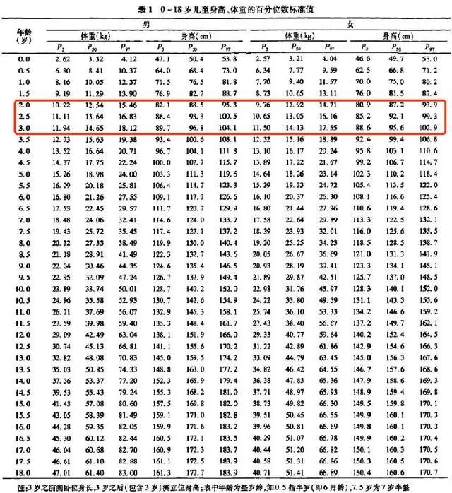 如果担心孩子身高,也可以看看这个表格,对照年龄和身高体重看看是否在正常范围内。