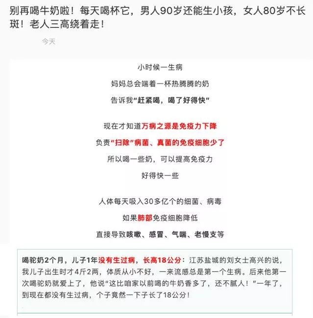 最近就有一个朋友发来一篇文章,说有人给她推荐骆驼奶。这个文章里说骆驼奶营养价值百科高,是最好的奶……文章中还举一个案例——孩子出生后喝两个月,一年长高18厘米……其他还一大堆的好处,什么有各种免疫因子呀,能提高免疫力呀,说的特别好,忍不住想要买。